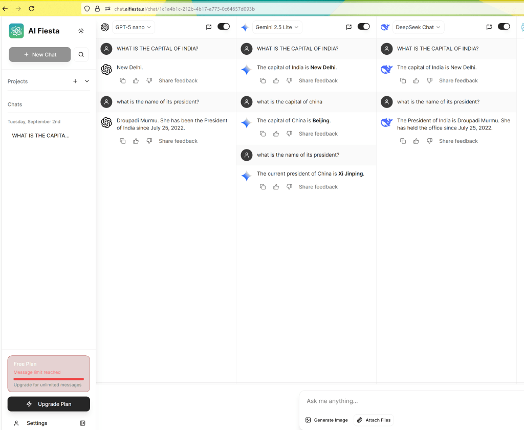AI Fiesta offers access to GPT 5 API only, which is nowhere close to the functionality and features provided by the free AI platforms like ChatGPT, Gemini, Perplexity, Grok, and Claude.